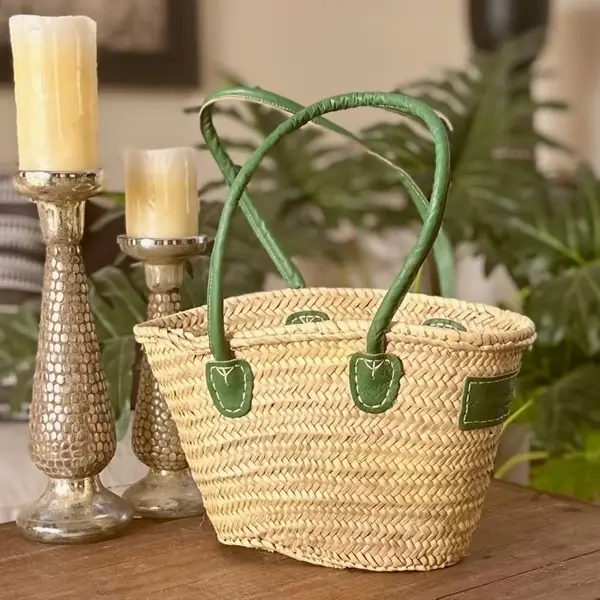 A small Moroccan handwoven basket bag with thick 50cm emerald green leather handles. Can be carried or worn over the shoulder.